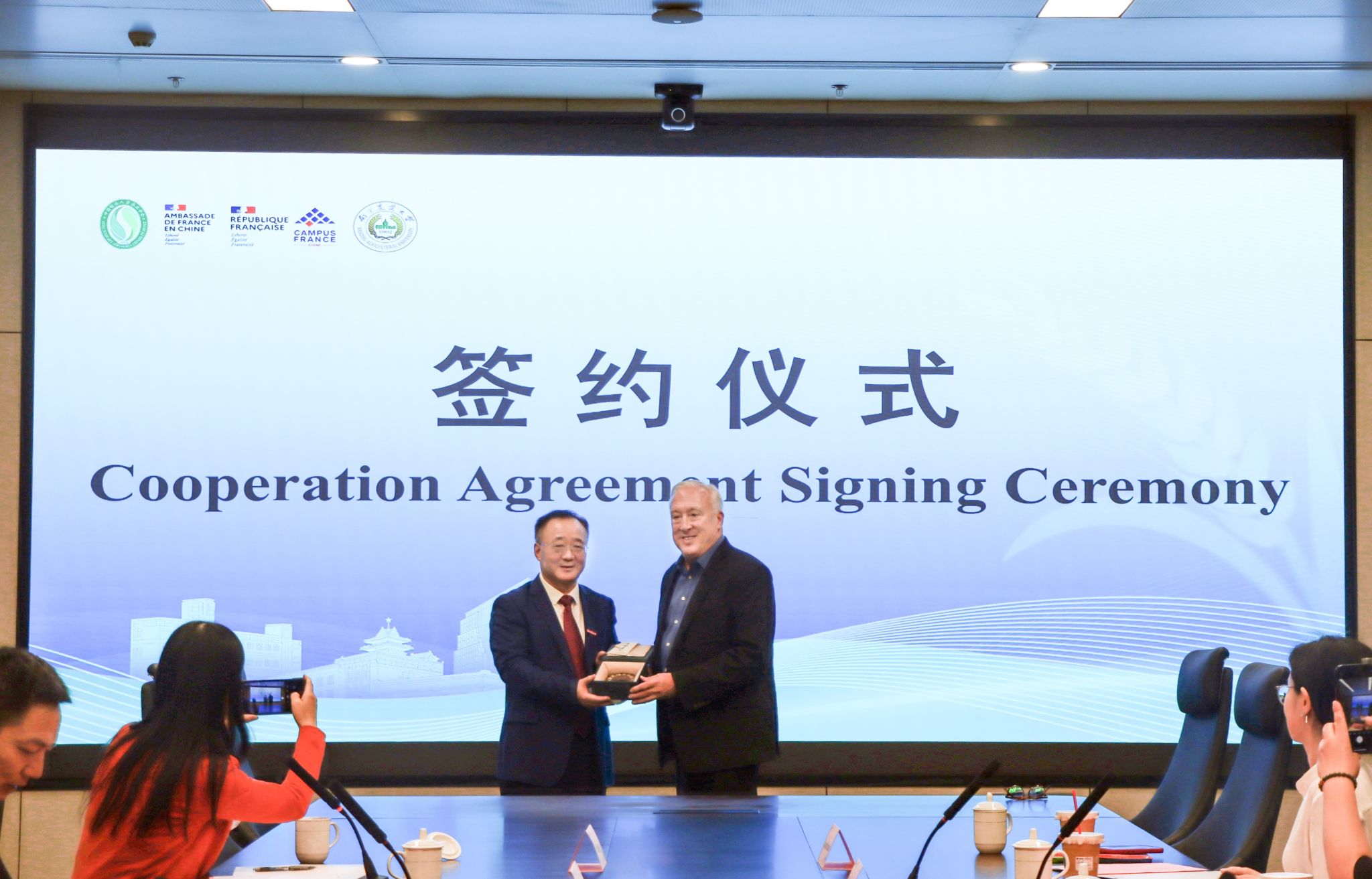 法国驻上海总领事馆教育领事Benjamin Demiere、法国高等教育署南京办事处负责人陈倩耘、中国留法人员农业学会(AACF)学会联合创始人、首任会长李修庆、会长翁芳芳、SynTech Research集团全球营销总监Jasper Barnes、伟德bv1946官方网站校党委常委、副校长单正丰、国际合作与交流处副处长吴磊、bv1946伟德官网党总支书记林光华、留法农学会会员代表等中外嘉宾出席签约仪式。